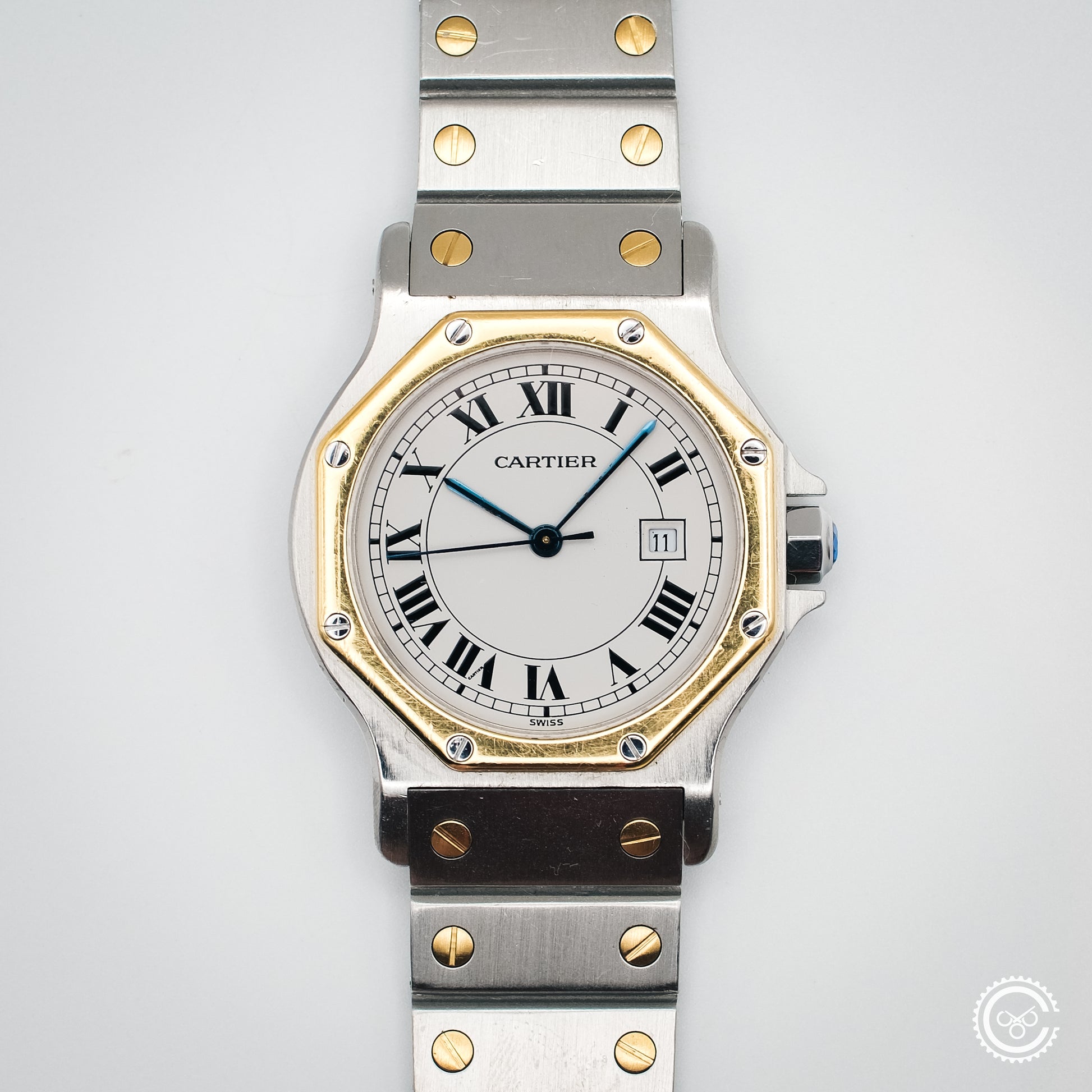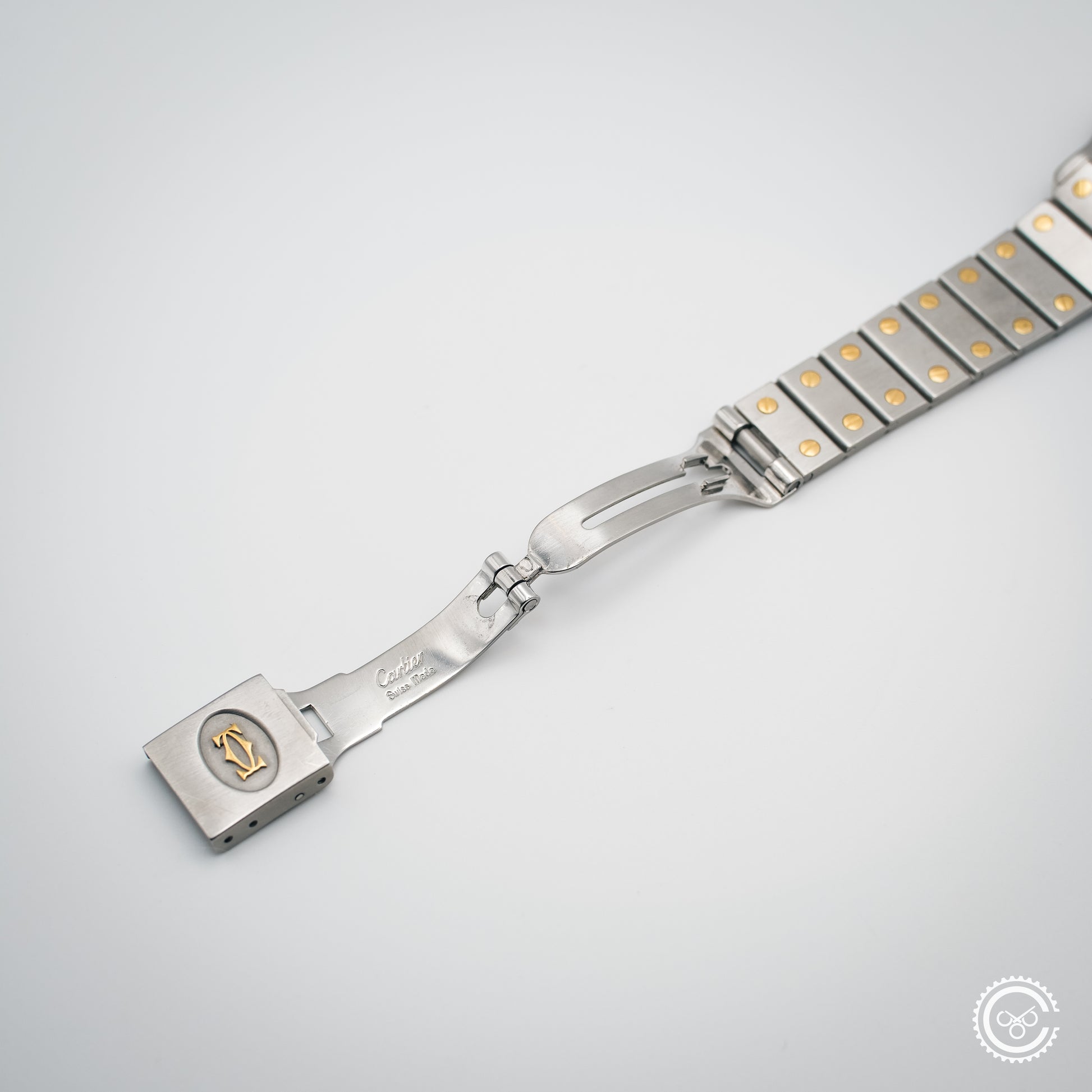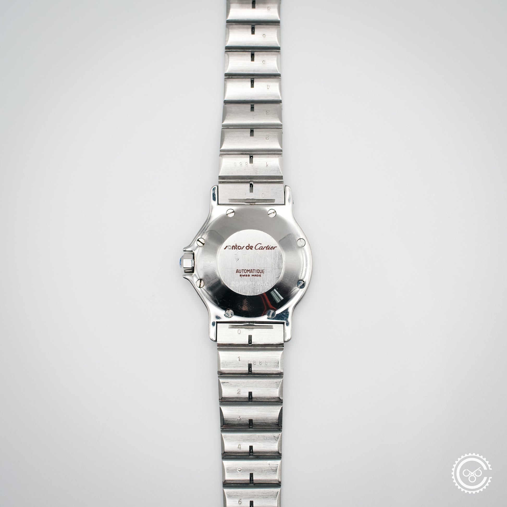 This example from the 1990s–early 2000s remains unpolished and all original, with numerous light hairline scratches across the case and bracelet from careful wear. The bracelet is stainless steel with 18k yellow gold screws, fitted with a secure clasp. The sapphire crystal is clean, and the Cartier calibre 2671 automatic movement runs reliably.