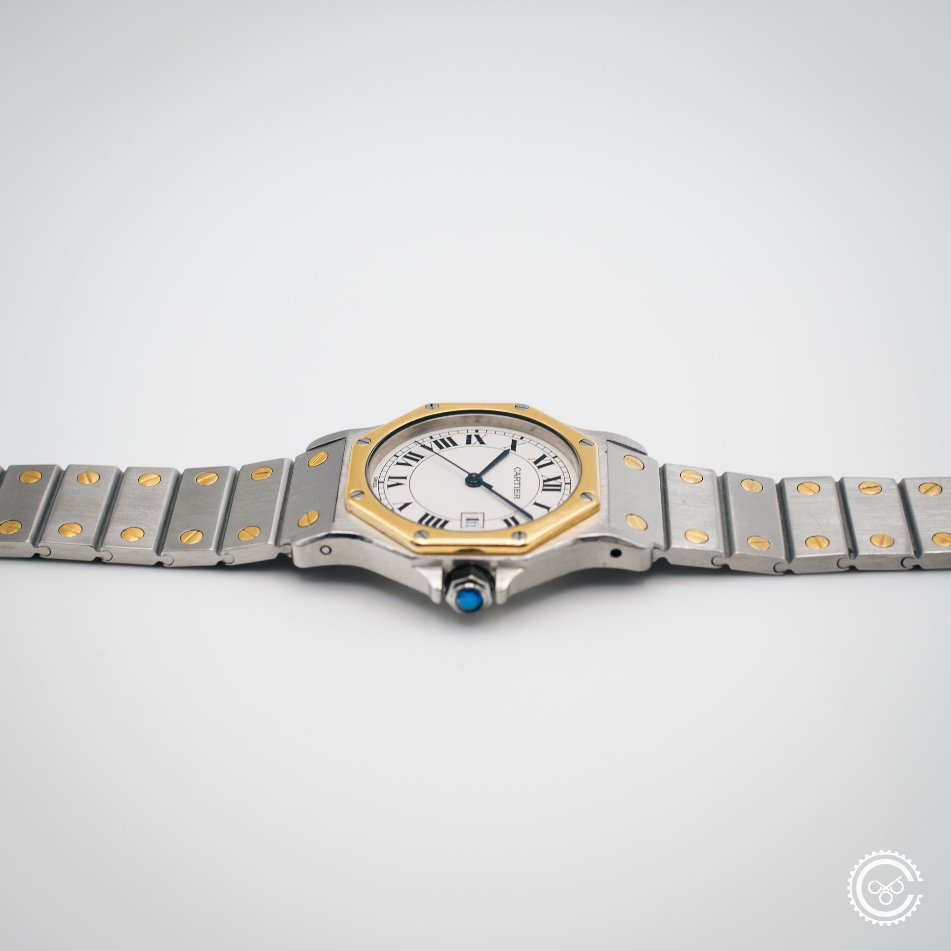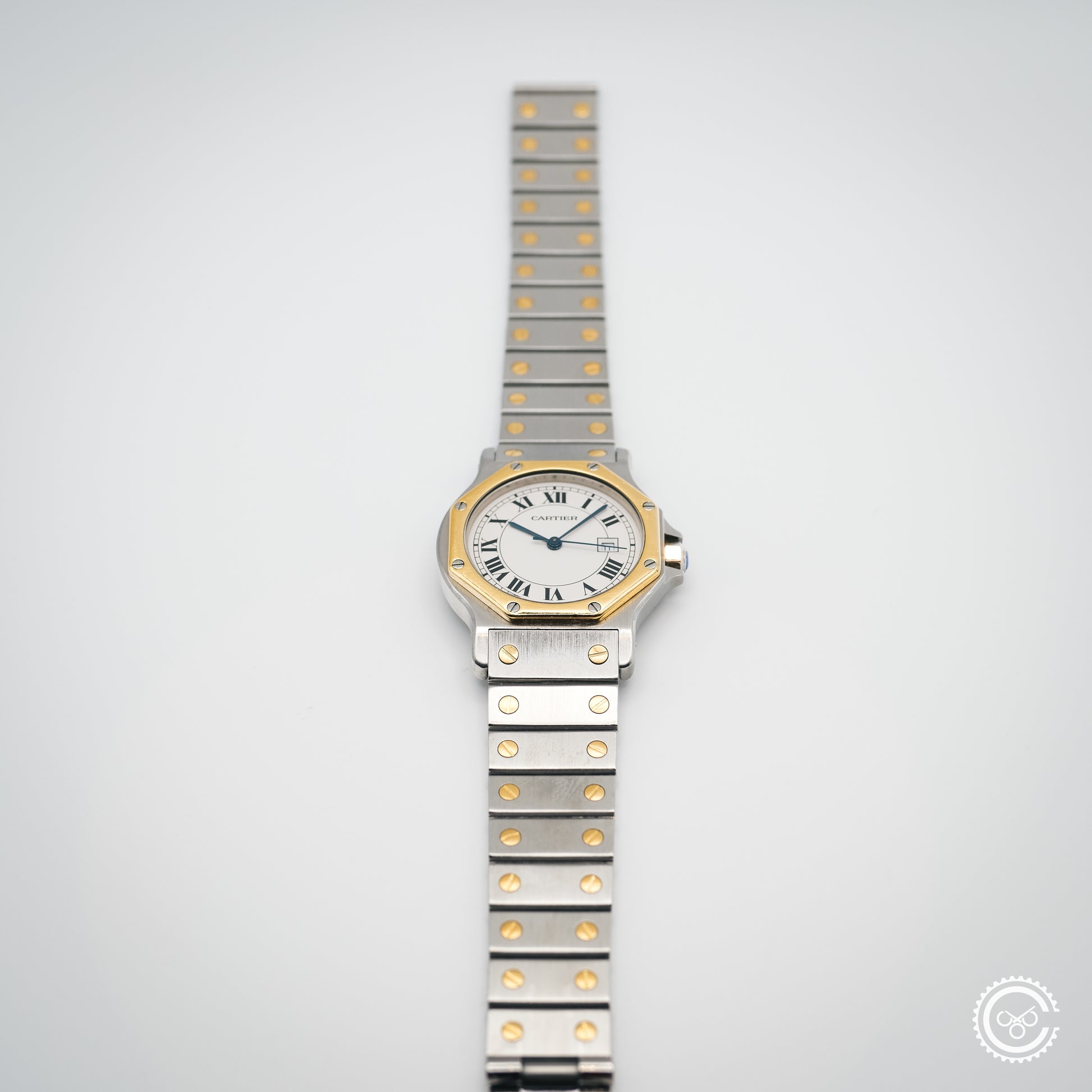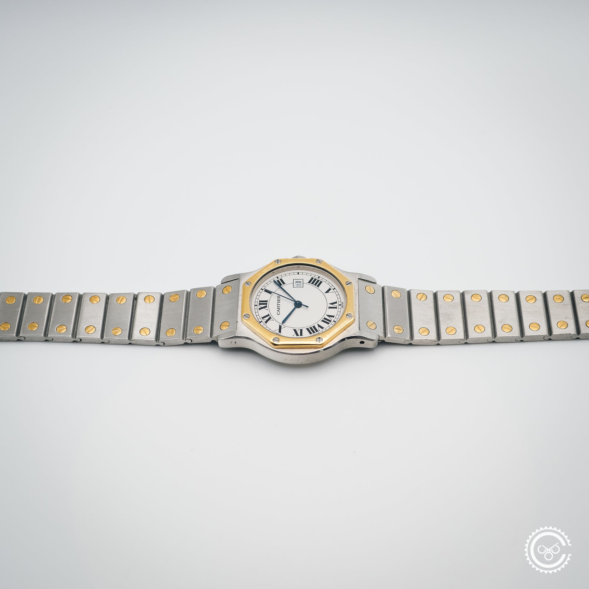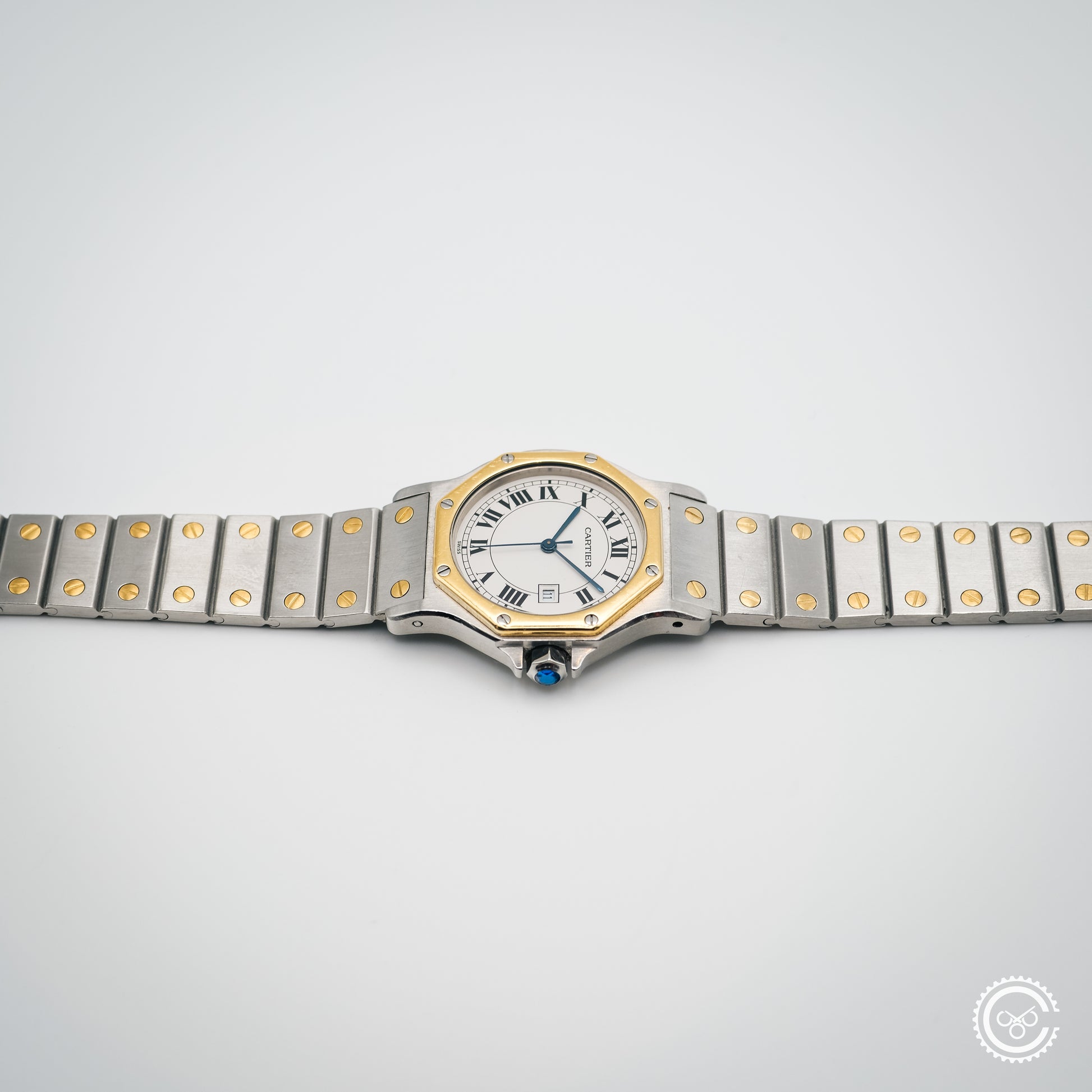A refined mid-size example of the Cartier Santos Galbée, reference 2966, blending sport and elegance in a timeless two-tone design. Featuring a stainless steel case with an 18k yellow gold bezel, white Roman numeral dial, blued steel hands, and a date display at 3 o’clock, this watch captures Cartier’s signature style.