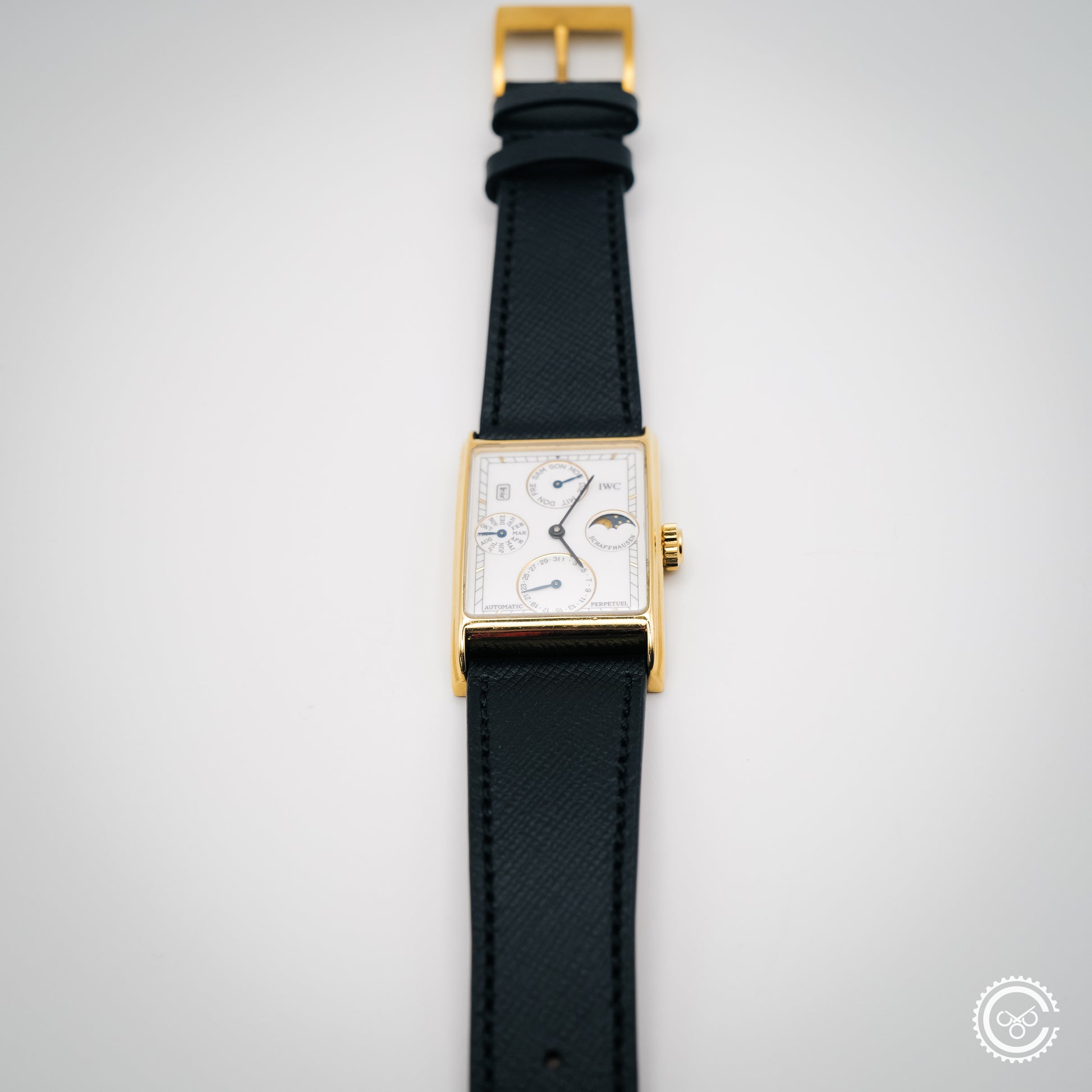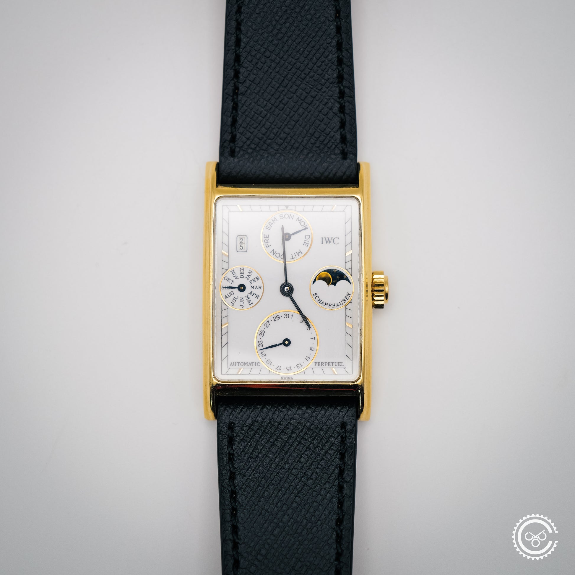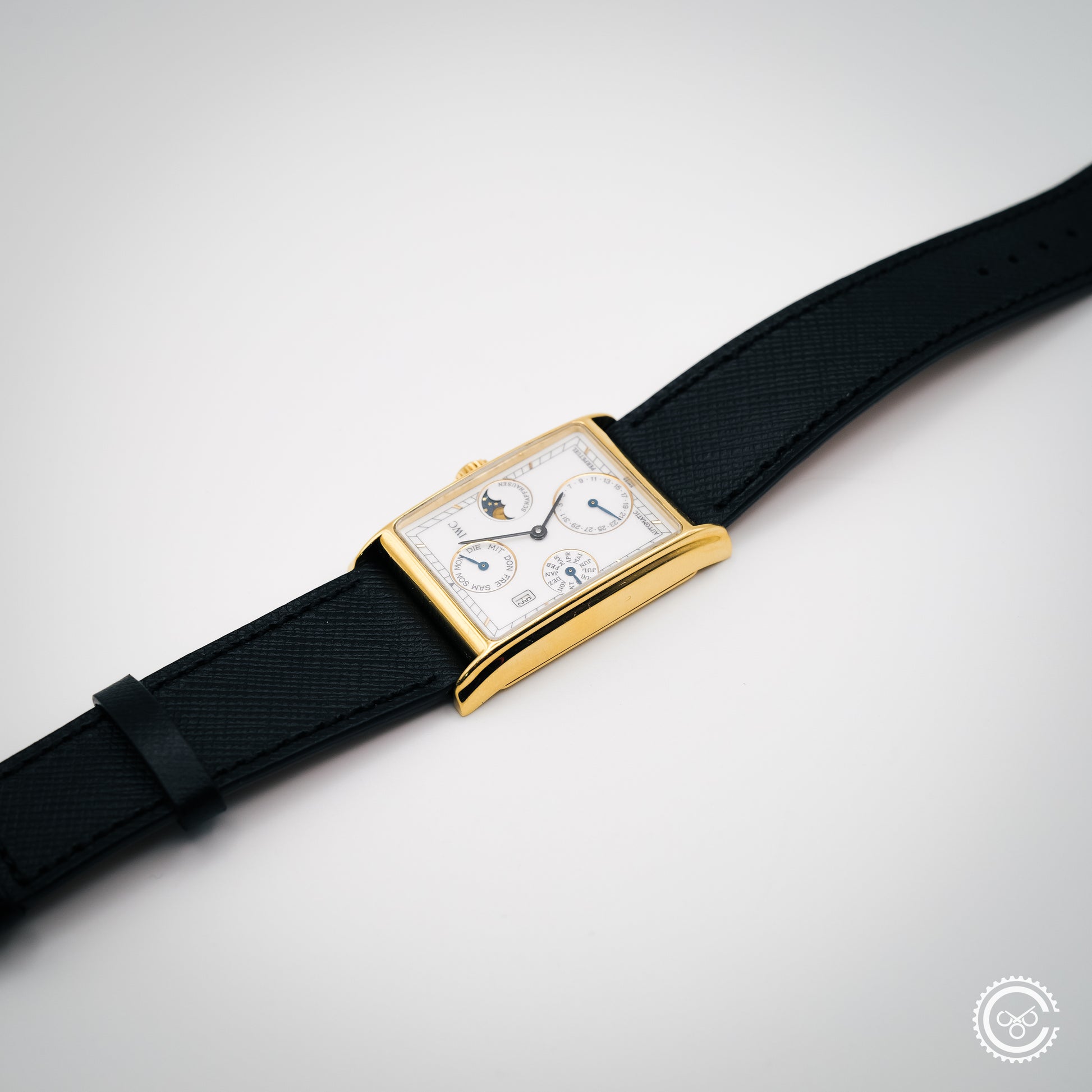 A beautifully presented IWC Novecento Perpetual Calendar in 18k yellow gold. Powered by the automatic Calibre 32062, the Novecento combines a curved rectangular case with IWC’s signature perpetual calendar displaying day, date, month, moon-phase and year.