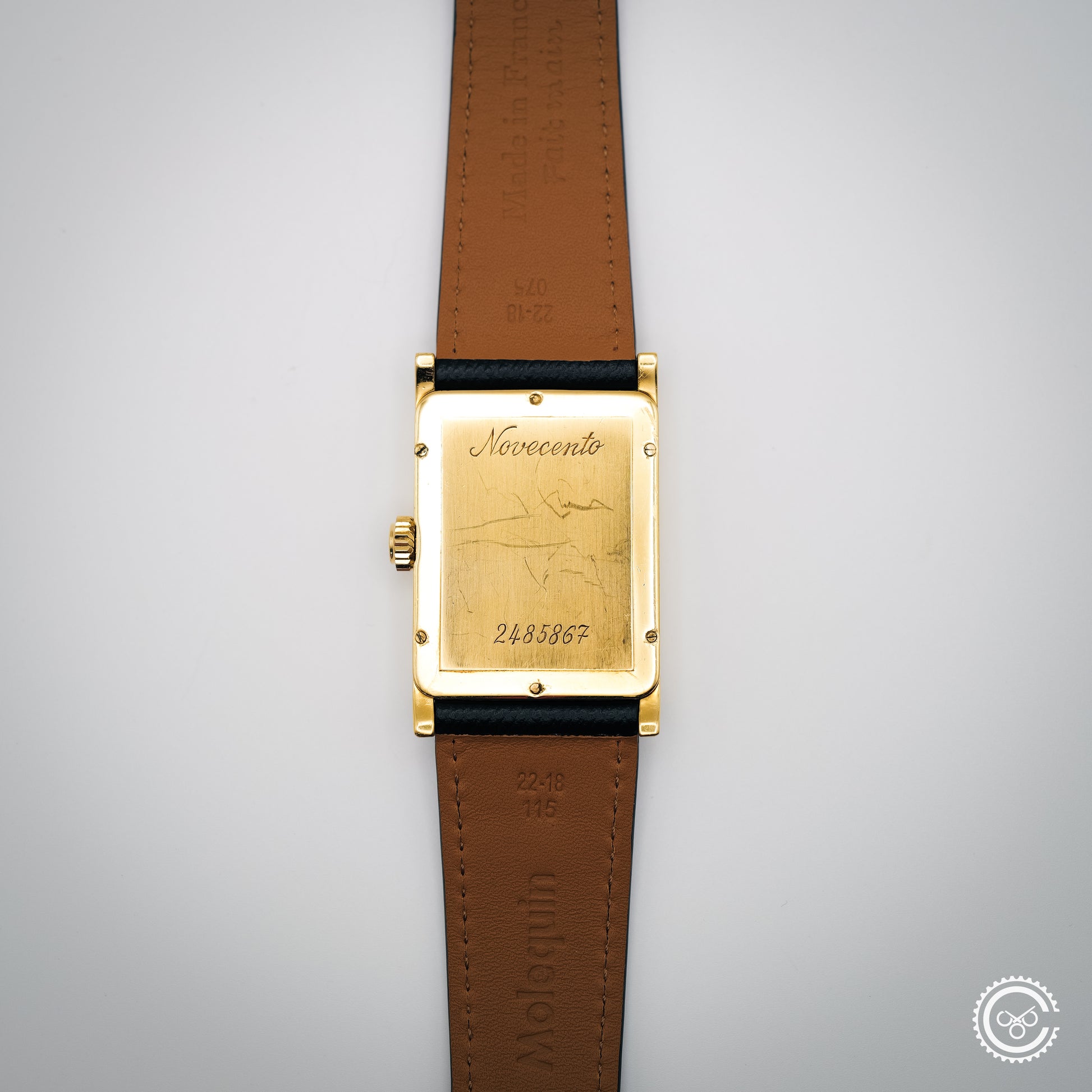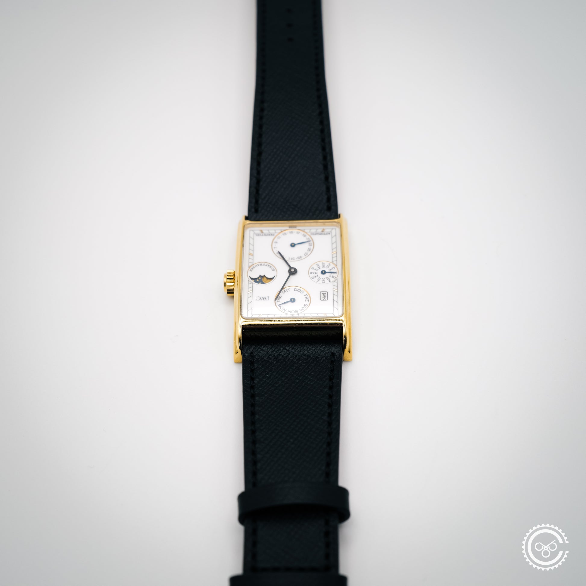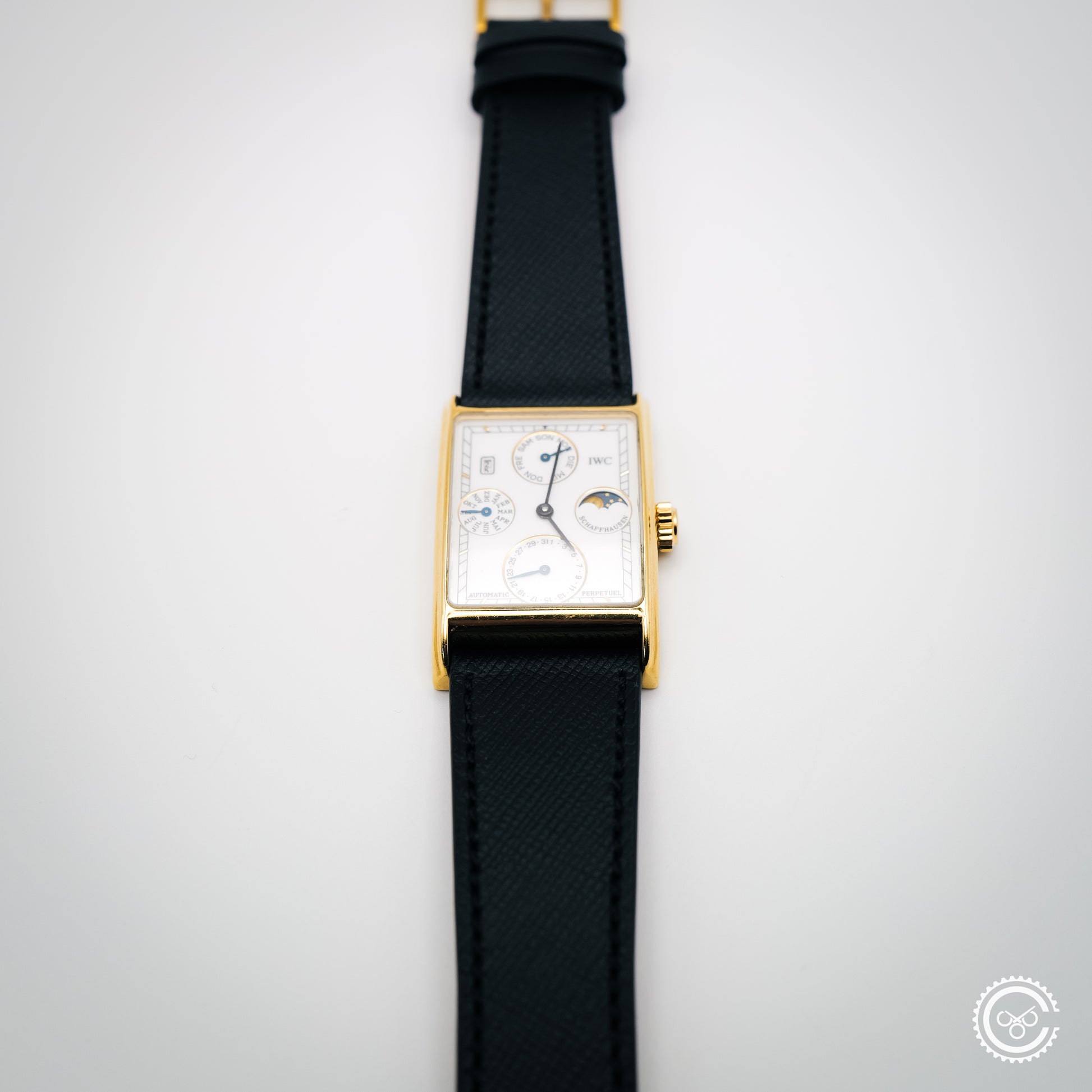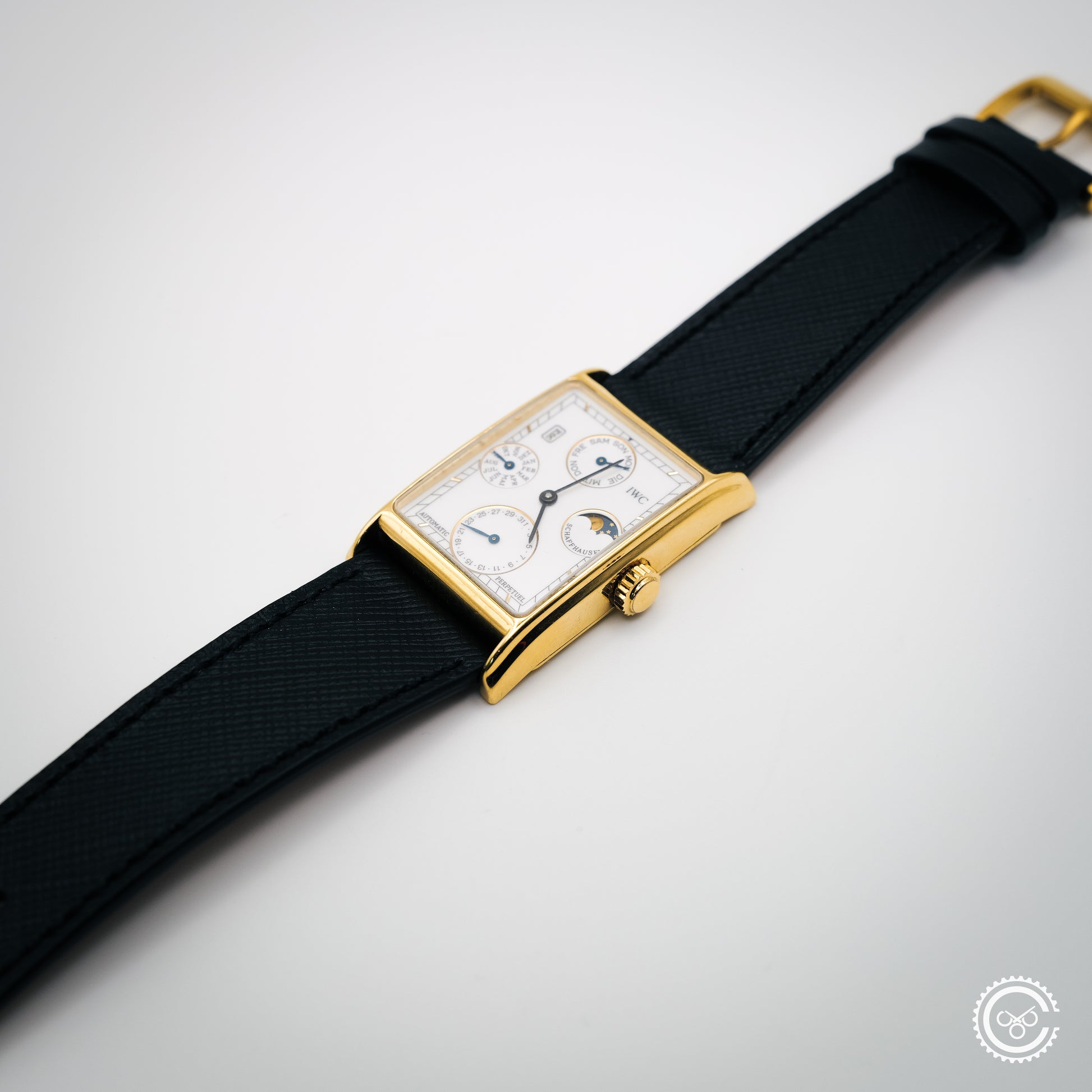 A beautifully presented IWC Novecento Perpetual Calendar in 18k yellow gold. Powered by the automatic Calibre 32062, the Novecento combines a curved rectangular case with IWC’s signature perpetual calendar displaying day, date, month, moon-phase and year.