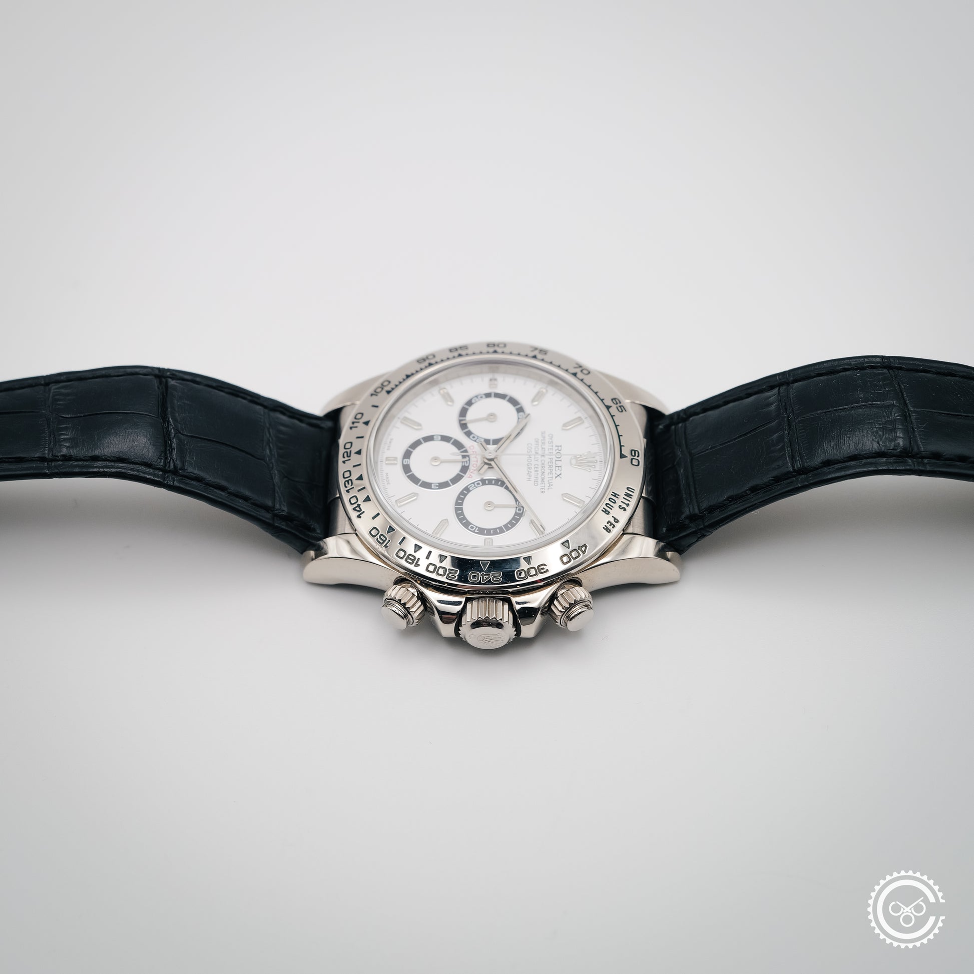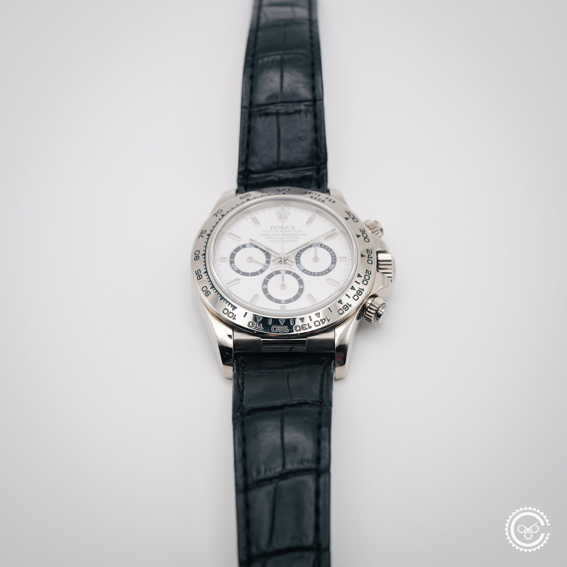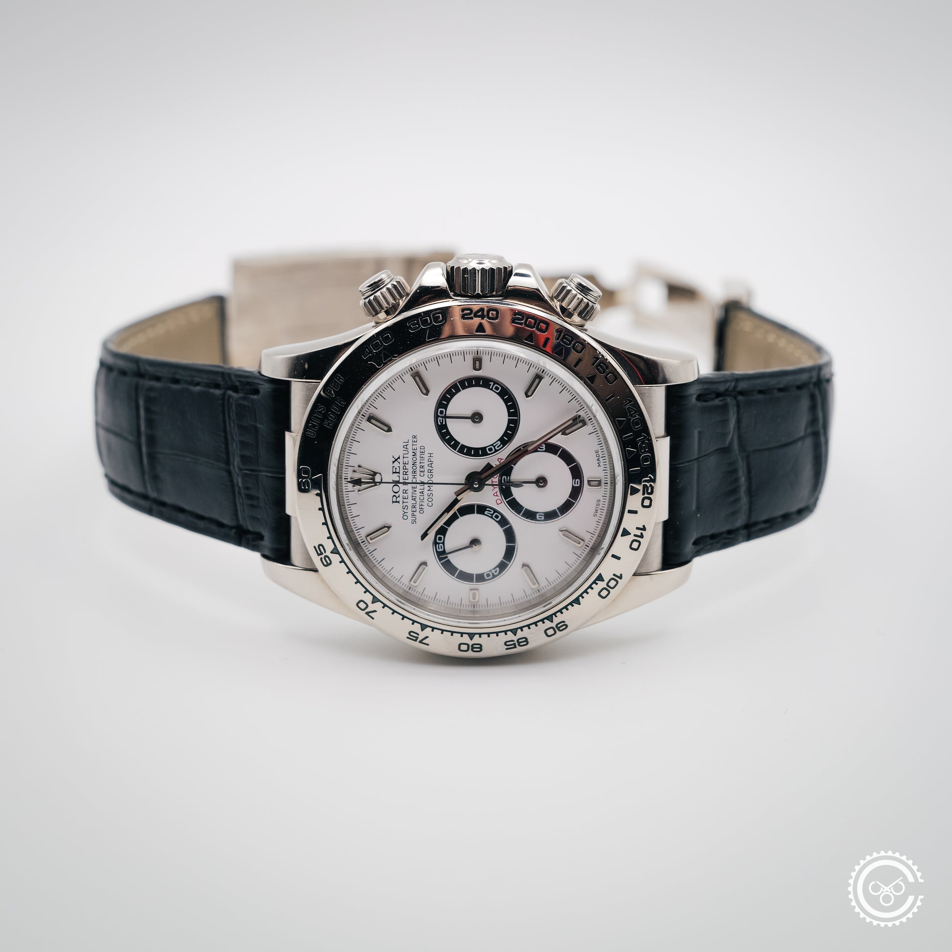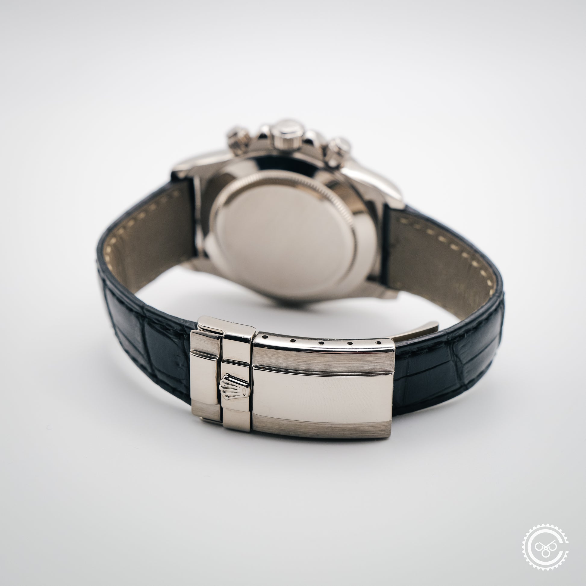 This watch is offered as watch only, which is common for examples of this age. What matters here is the condition and the overall honesty of the piece — and this is one of the better preserved white gold Zenith Daytonas I’ve come across.