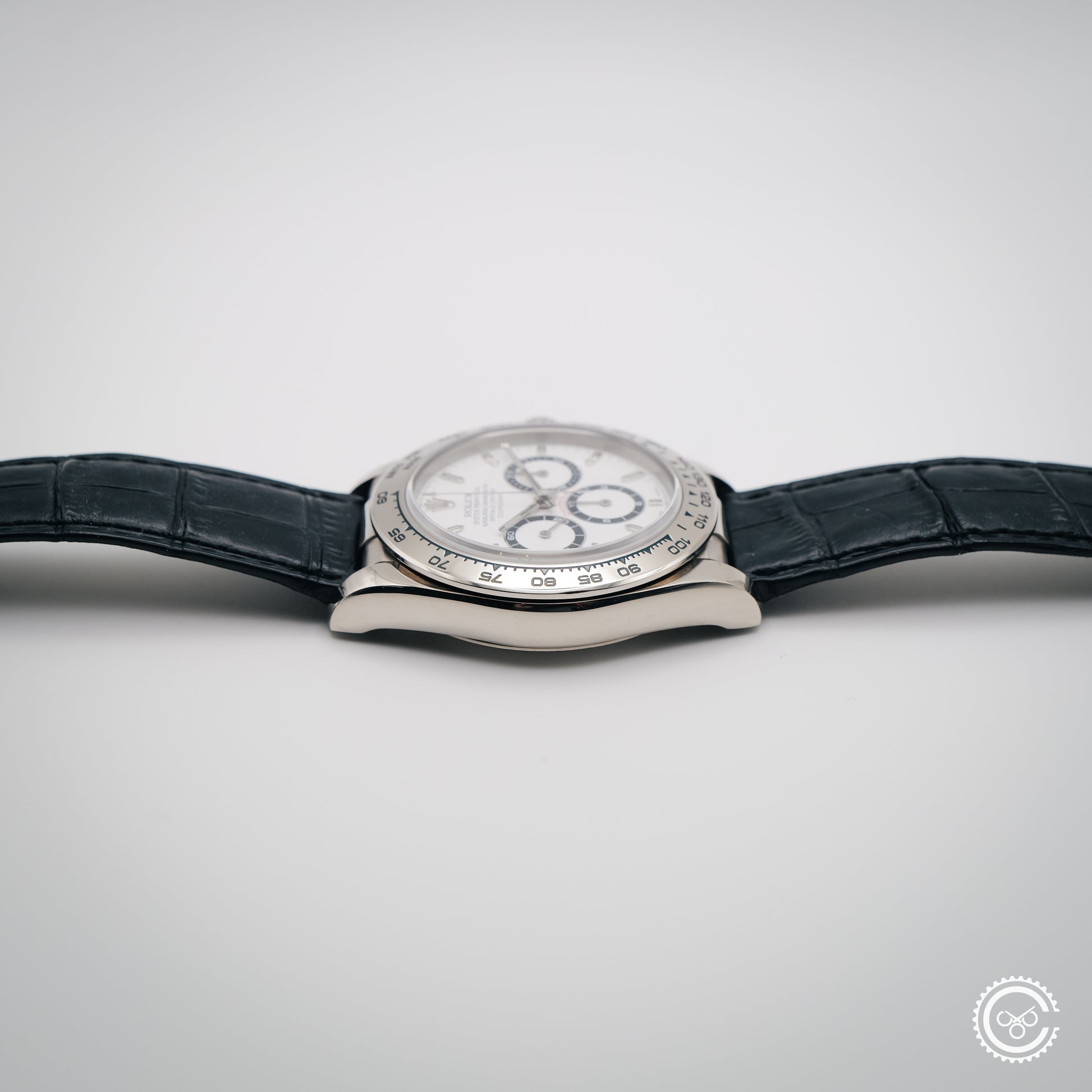 From a value perspective, the Zenith Daytonas still sit in a very interesting position. Modern steel Daytonas routinely trade at strong levels, yet for not dramatically more, this offers solid 18ct white gold, lower production numbers, and a movement that represents a genuinely important period in Daytona history. They’re robust enough to wear confidently, yet carry more character than later ceramic models.