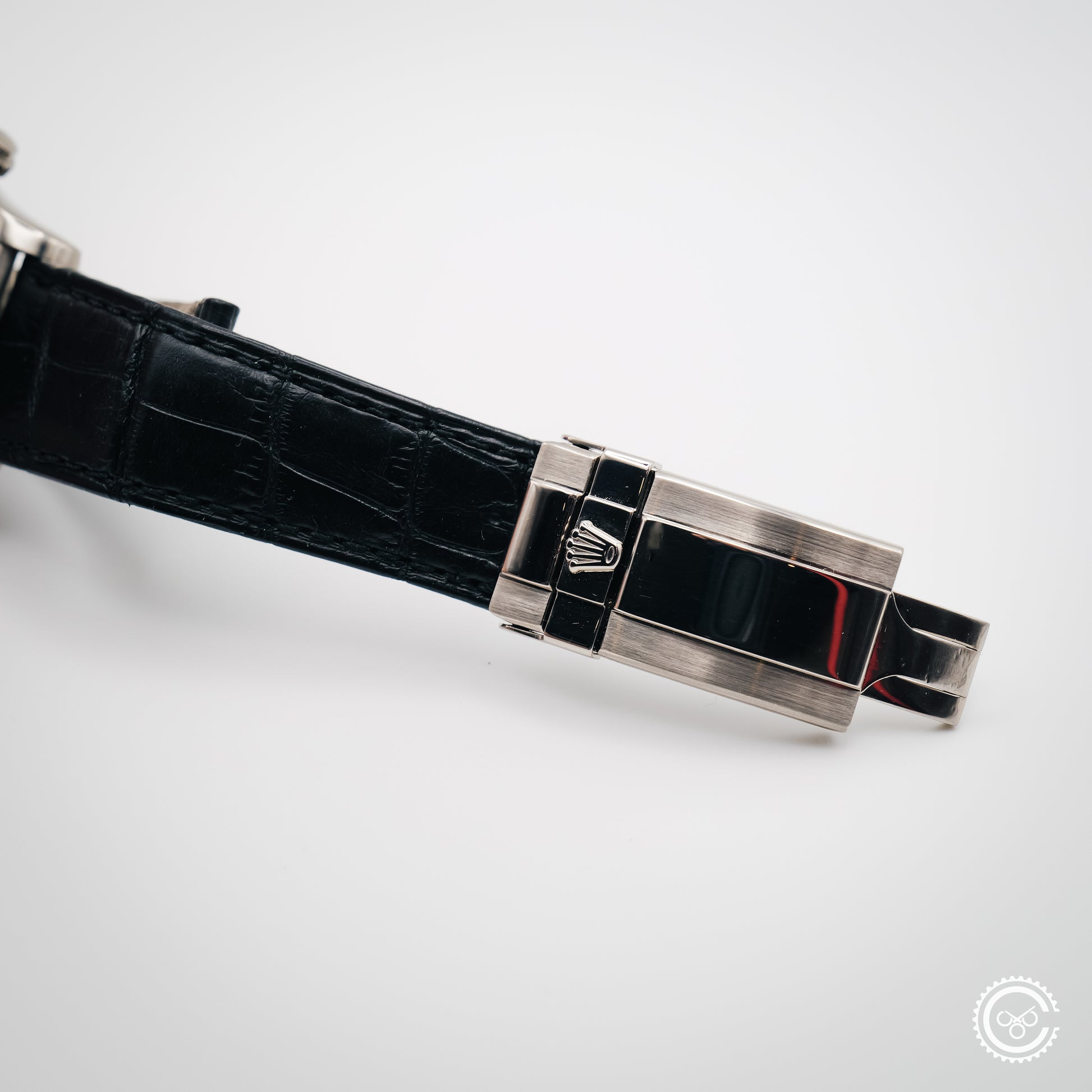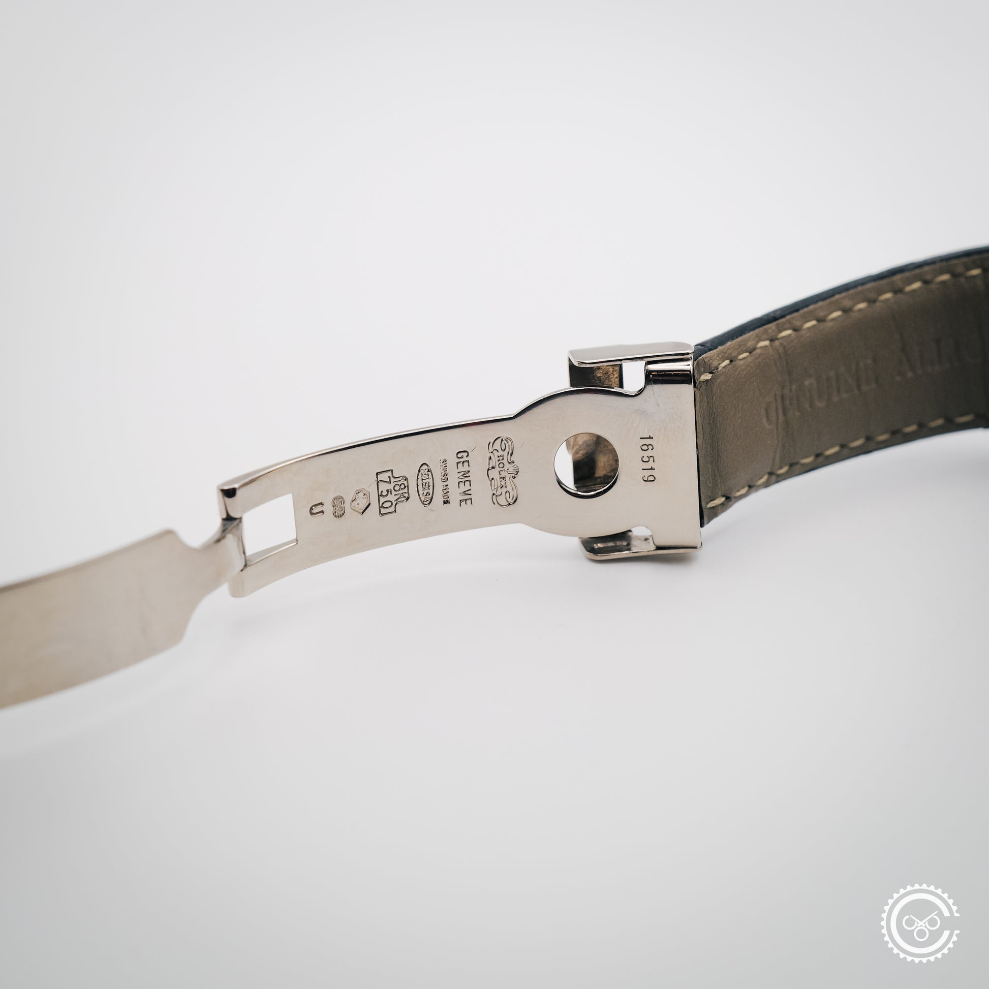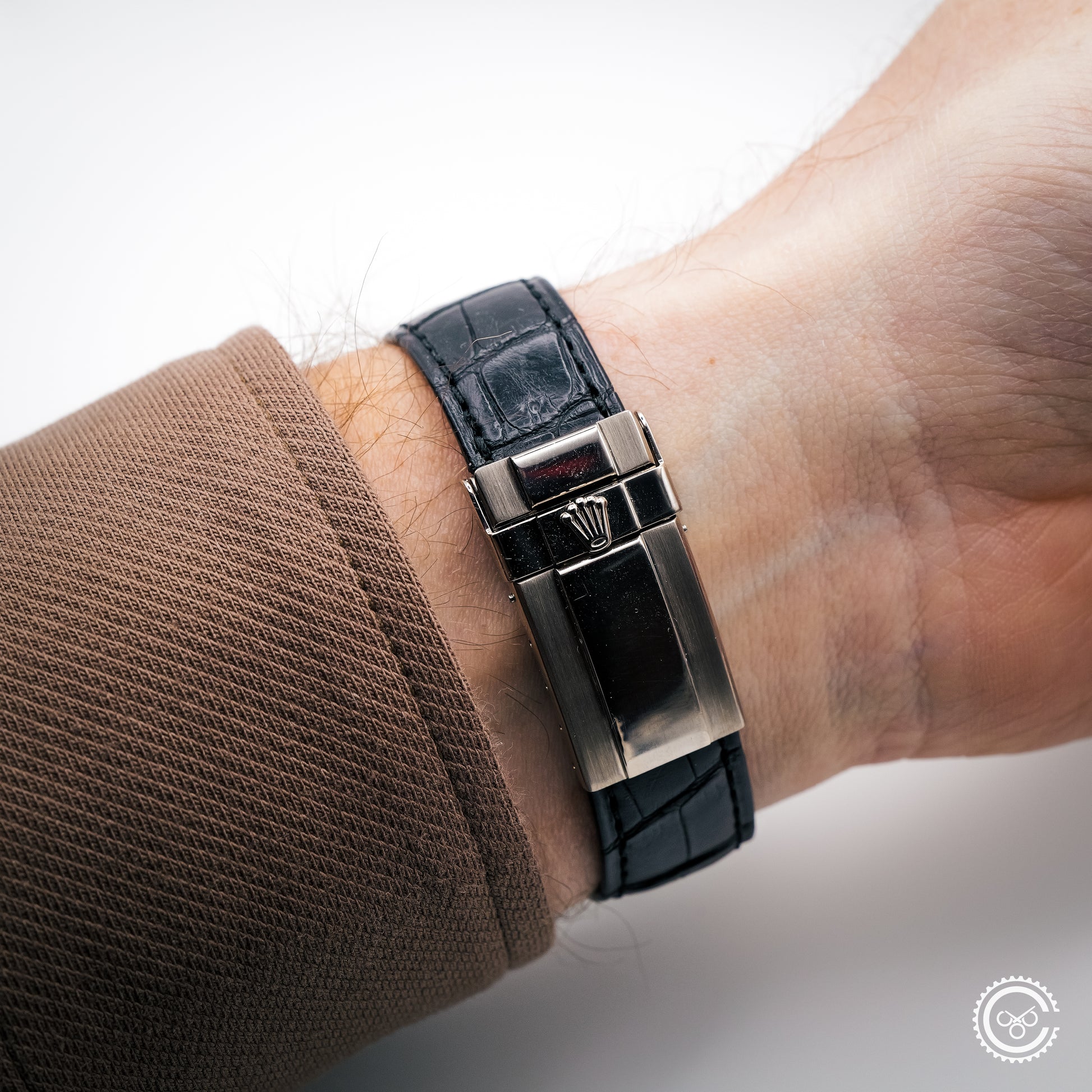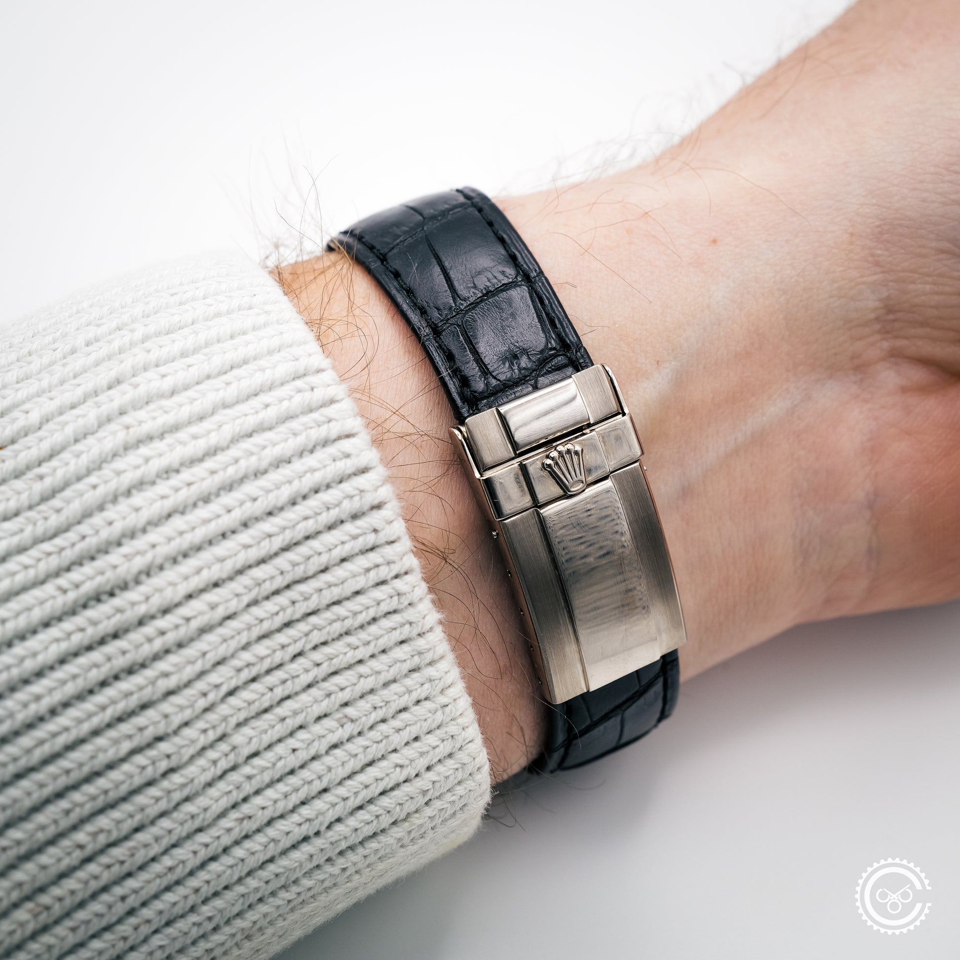 Within that generation, the leather-strap pieces have always felt slightly more considered. The yellow gold 16518 makes a statement. The white gold 16519 is more discreet.