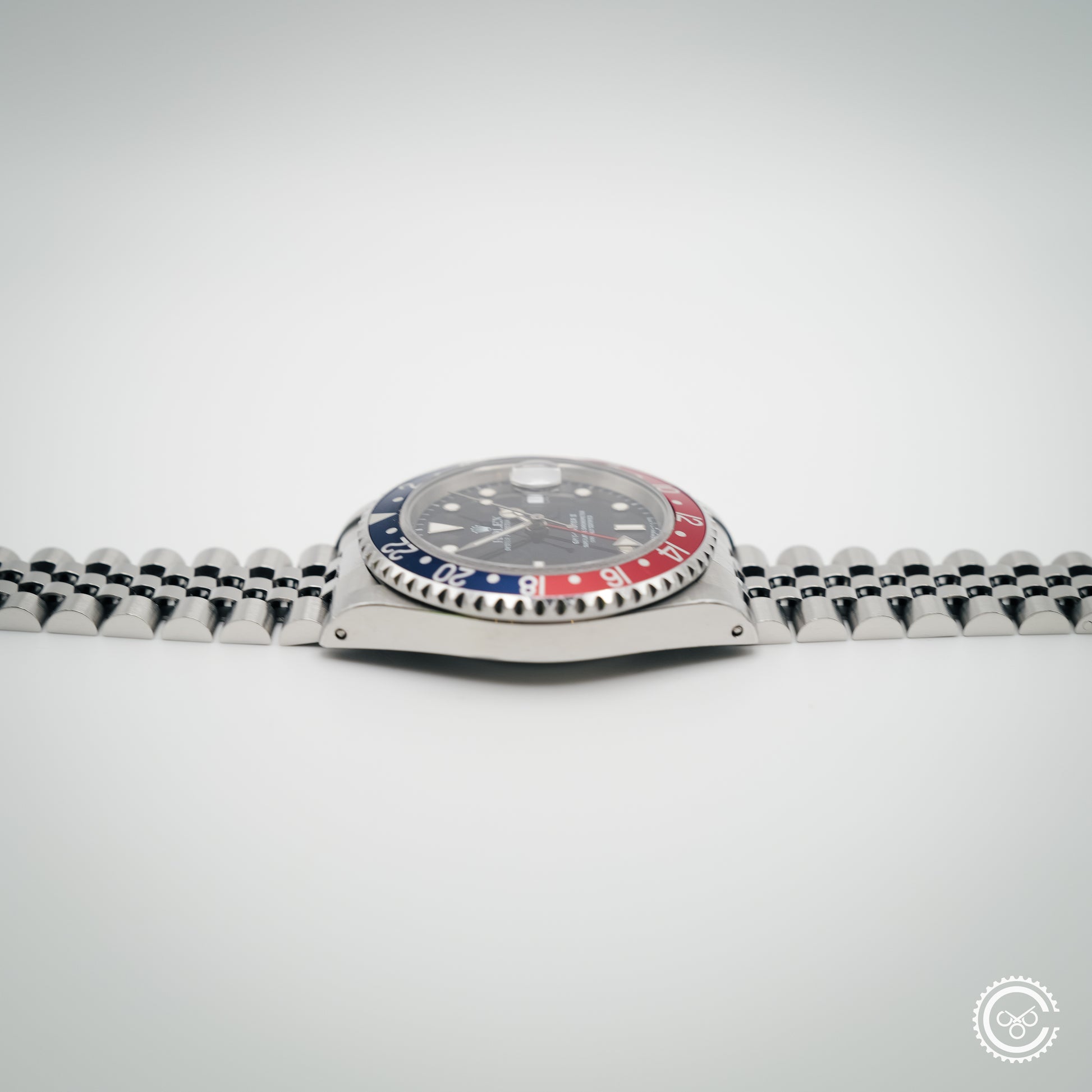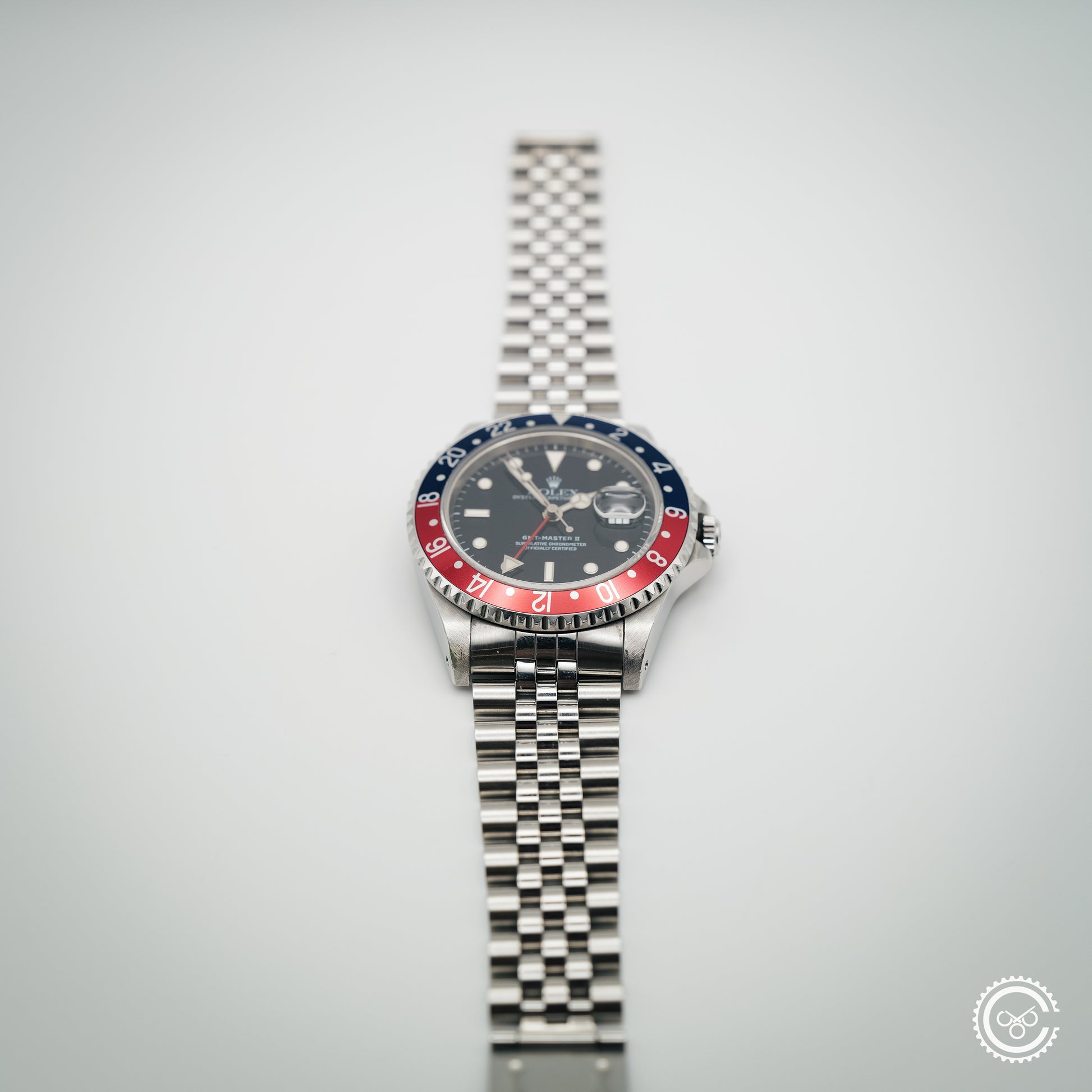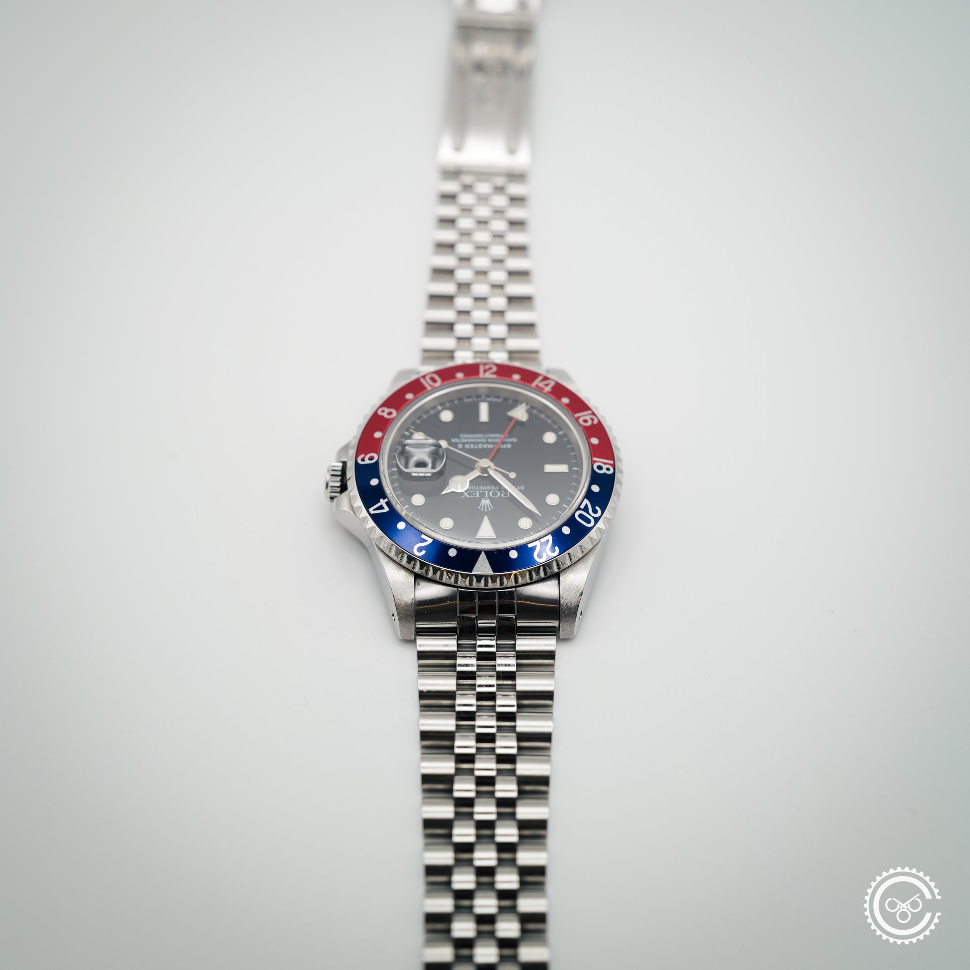 This 1996 Rolex GMT-Master II Pepsi is a standout example, notable for its exceptional condition and its original Jubilee bracelet, which remains impressively tight with virtually no stretch — something rarely seen on watches of this age. The Jubilee bracelet adds a touch of refinement and comfort that perfectly complements the sporty nature of the GMT-Master.