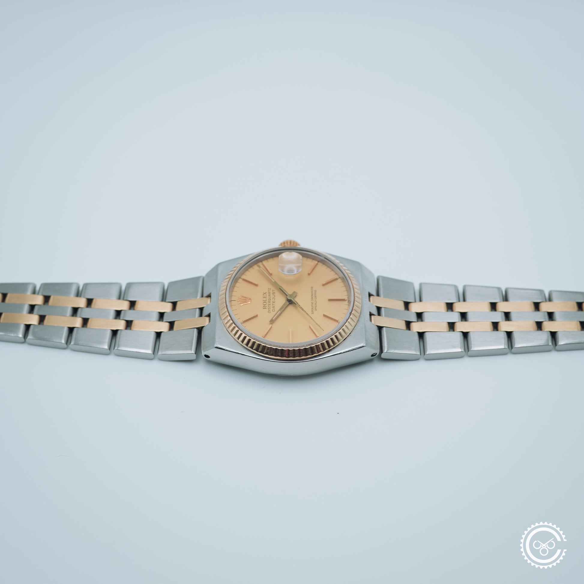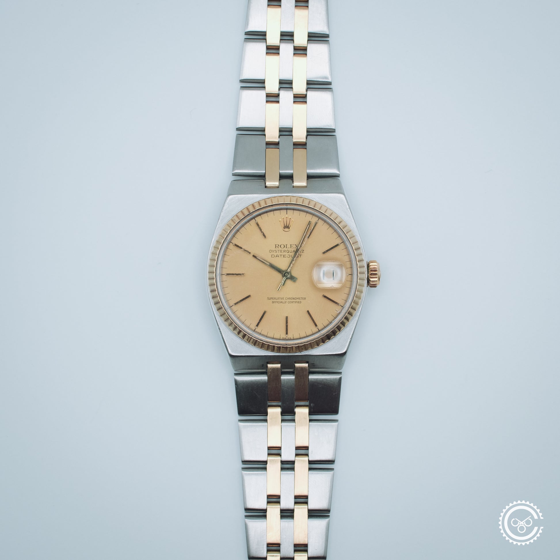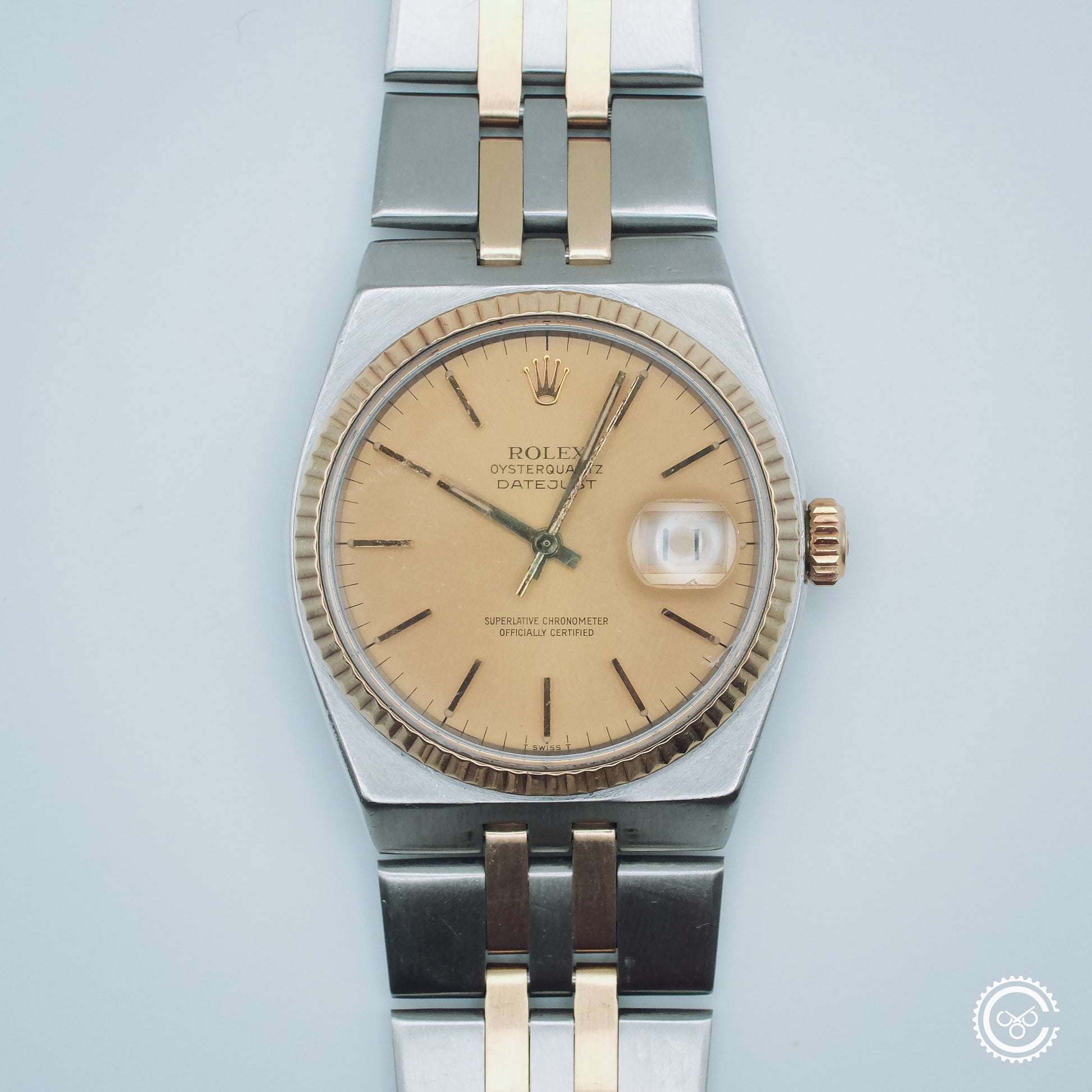 An early example of the Oysterquartz Datejust, reference 17013. This piece features a soft gold-tone dial with tritium lume, framed by a yellow gold fluted bezel and paired with the original integrated steel and gold bracelet. The angular case architecture and brushed surfaces remain distinct within the Rolex catalogue — a sharp contrast to its automatic counterpart.