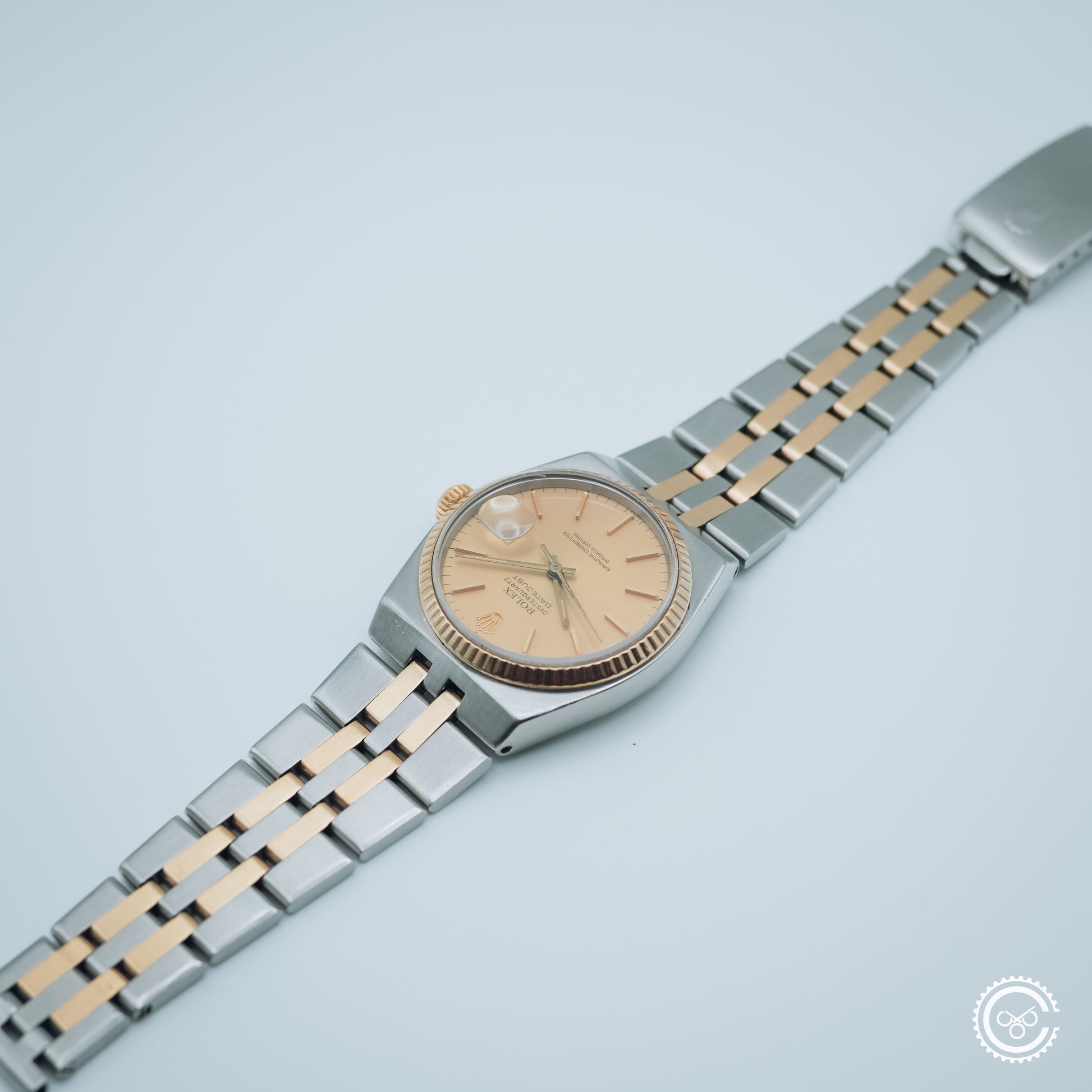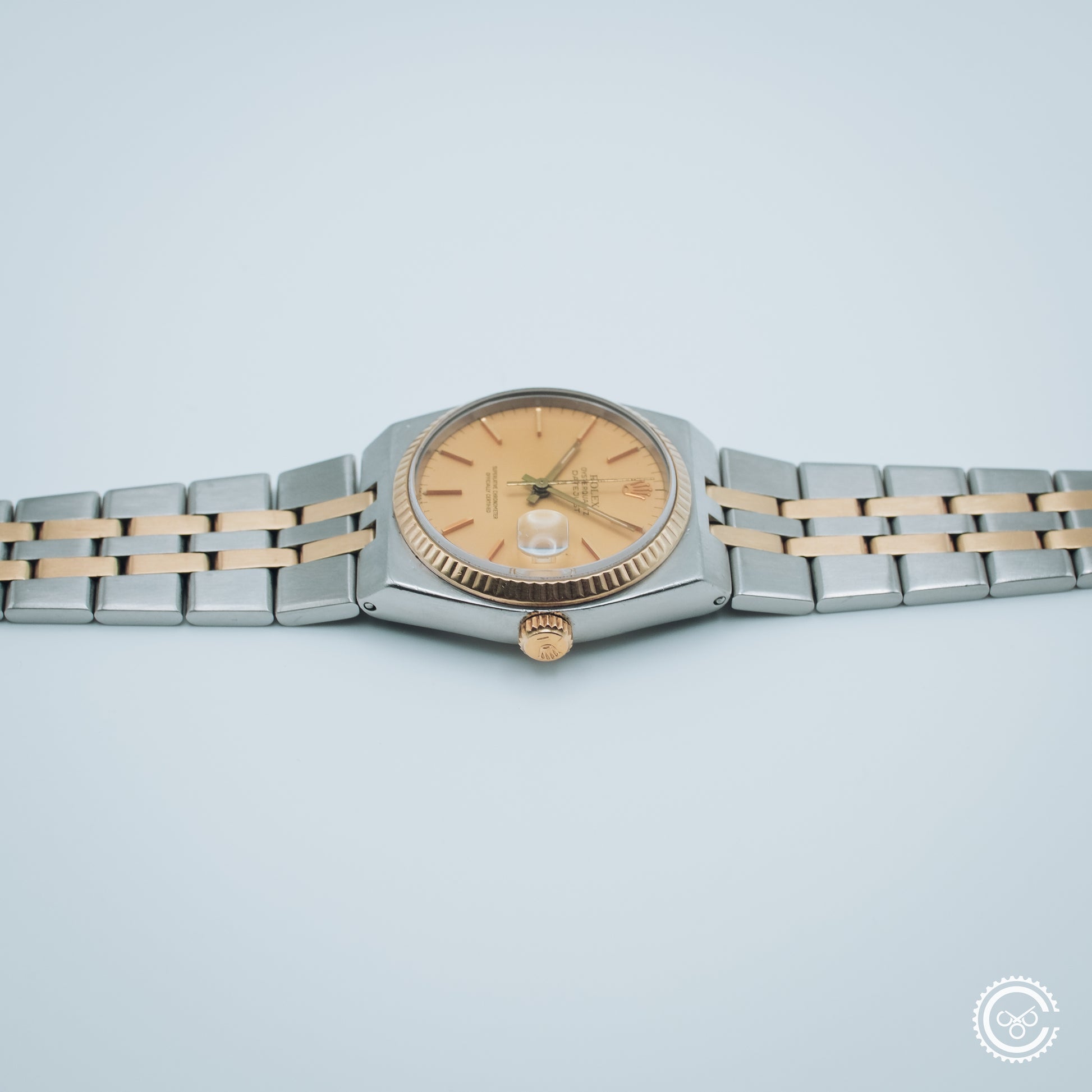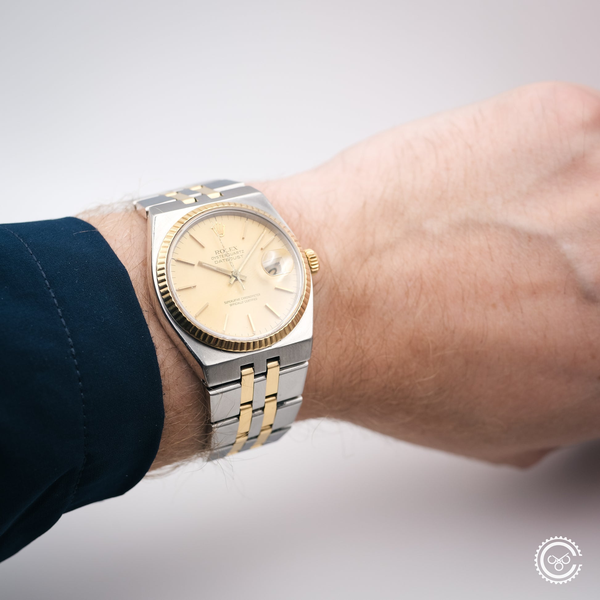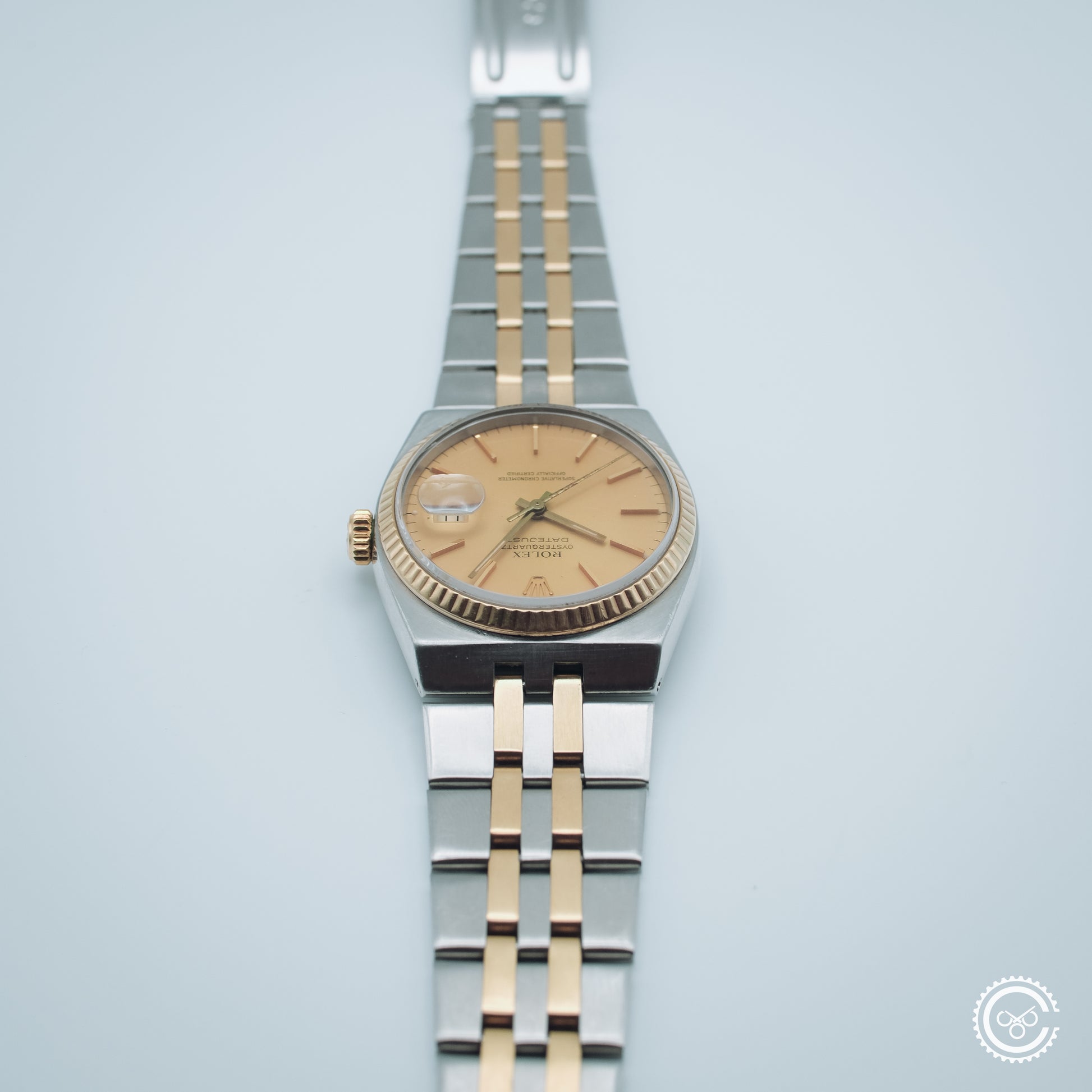 An early example of the Oysterquartz Datejust, reference 17013. This piece features a soft gold-tone dial with tritium lume, framed by a yellow gold fluted bezel and paired with the original integrated steel and gold bracelet. The angular case architecture and brushed surfaces remain distinct within the Rolex catalogue — a sharp contrast to its automatic counterpart.