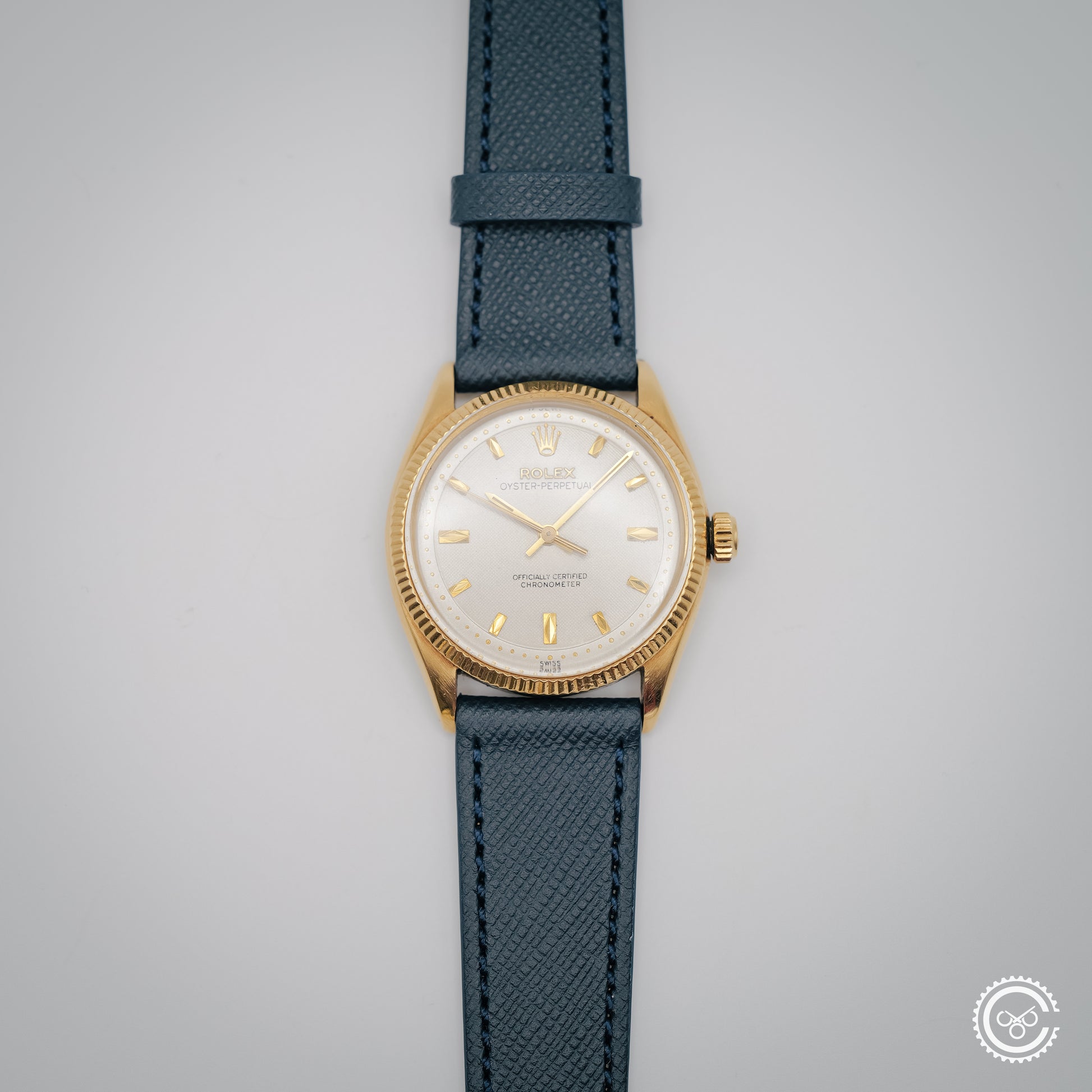 There’s a certain charm to Rolex in the mid-1950s — a softer design language, slimmer profiles, and a calmer confidence before the brand moved into the sharper, sportier shapes of the 60s. Reference 6567 lives in that earlier period, and you feel it immediately: the warm gold case, the silver sunburst dial, the dauphine hands, and the proportions that still feel refined almost 70 years later.